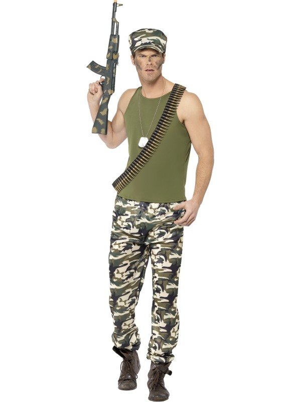 Denna maskeraddräkt innehåller en grön tröja, ett par byxor samt en hatt. För att verkligen komplettera och får ett riktigt miltärinspirerat utseende så bör du ha någon form av leksaksvapen samt kanske ett ammobälte.